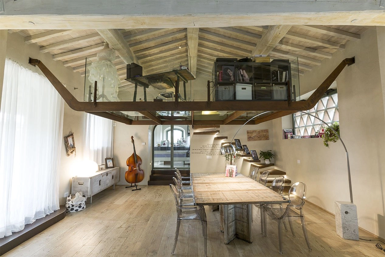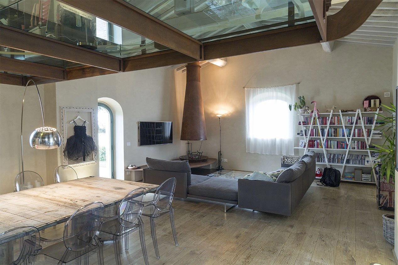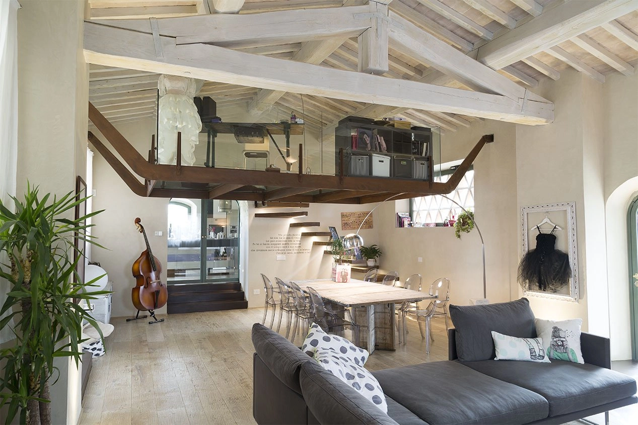 Un soppalco in vetro e ferro rafforza il dialogo tra interno ed esterno, così come il volume di collegamento che apre una prospettiva inedita sulle colline del Chianti.