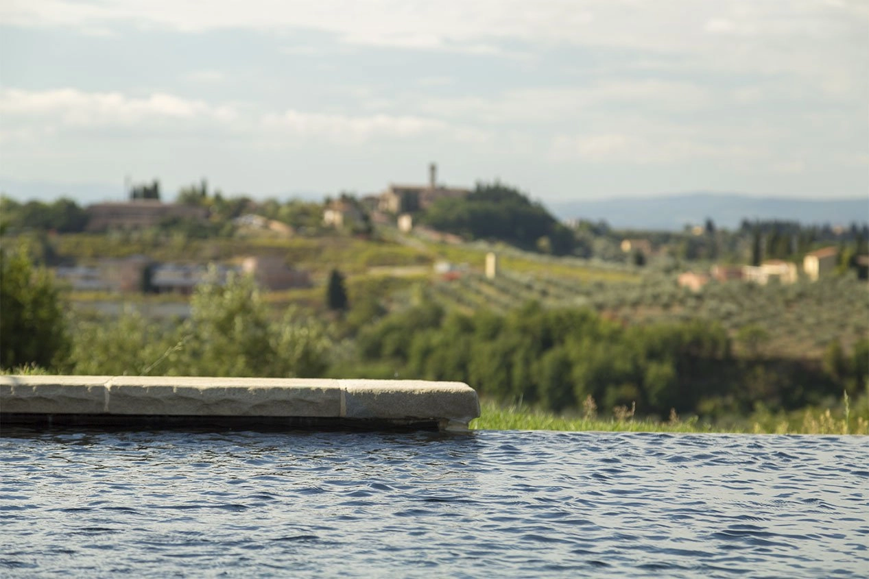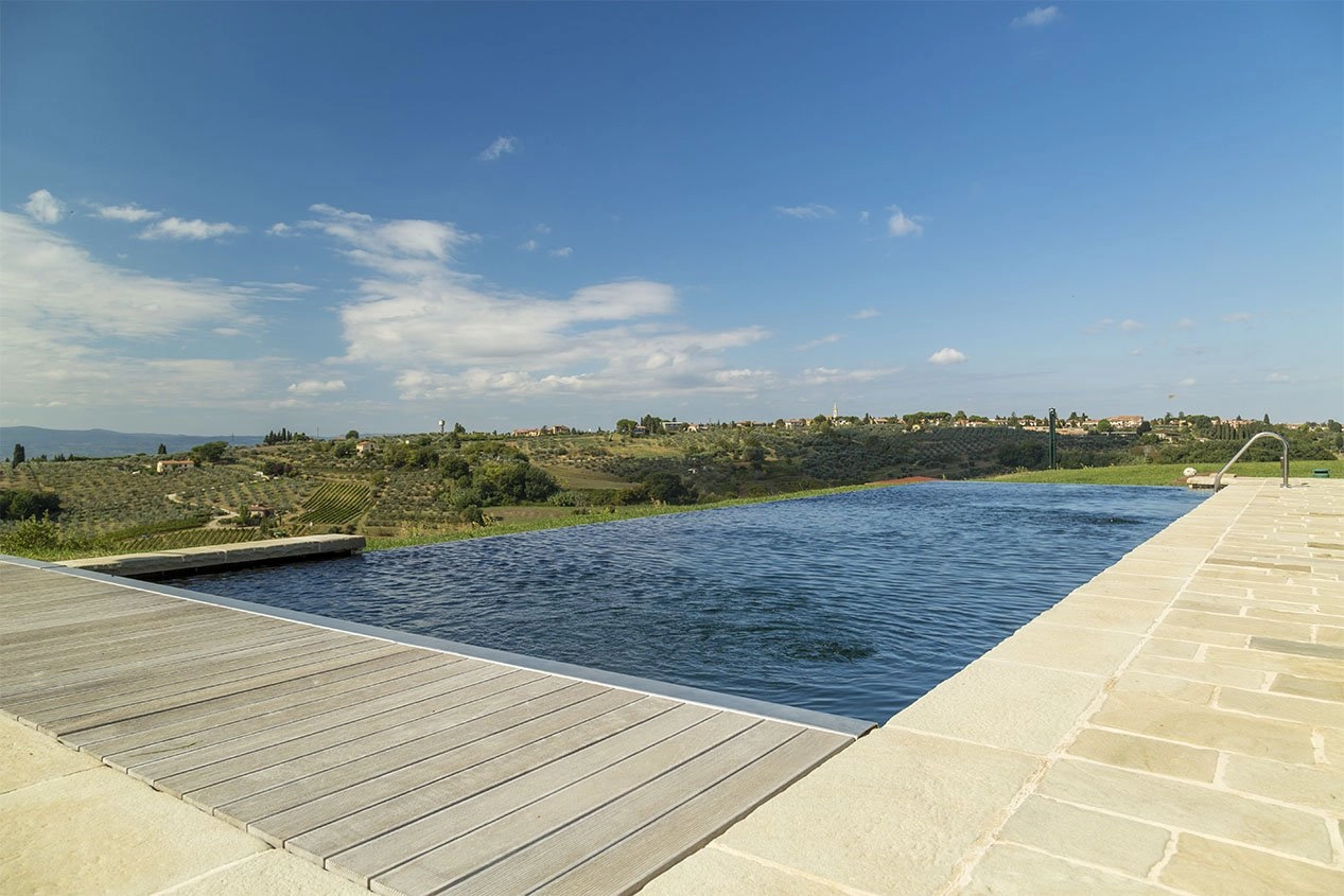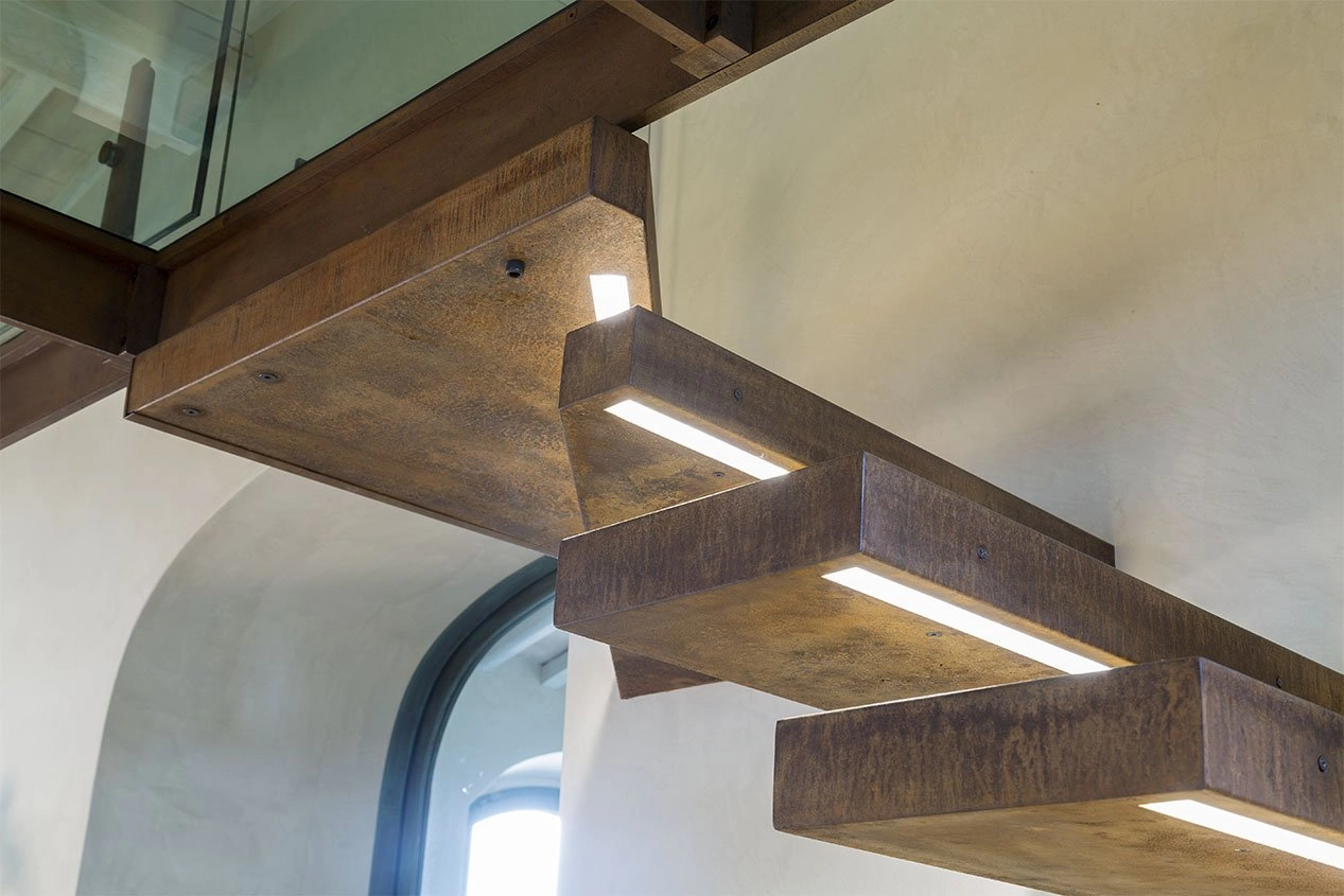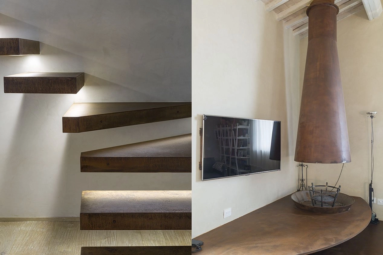Un soppalco in vetro e ferro rafforza il dialogo tra interno ed esterno, così come il volume di collegamento che apre una prospettiva inedita sulle colline del Chianti.