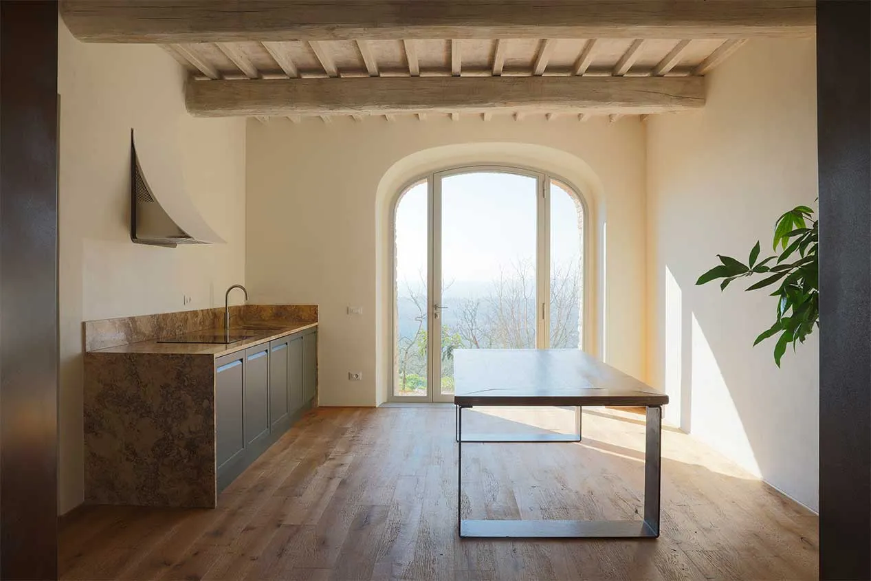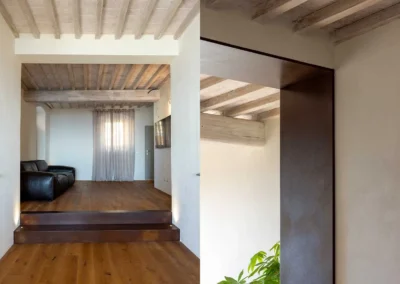 In the heart of the historic centre, a house with strong original features is reinterpreted. The project starts from a critical issue: limited visual depth and reduced functionality. New views are opened towards the rear garden and the interior spaces are transformed into an open plan laid out on two levels. Aged oak floors, bleached ceilings and corten steel details engage in dialogue with the historical memory, enriching it with modern and evocative elements